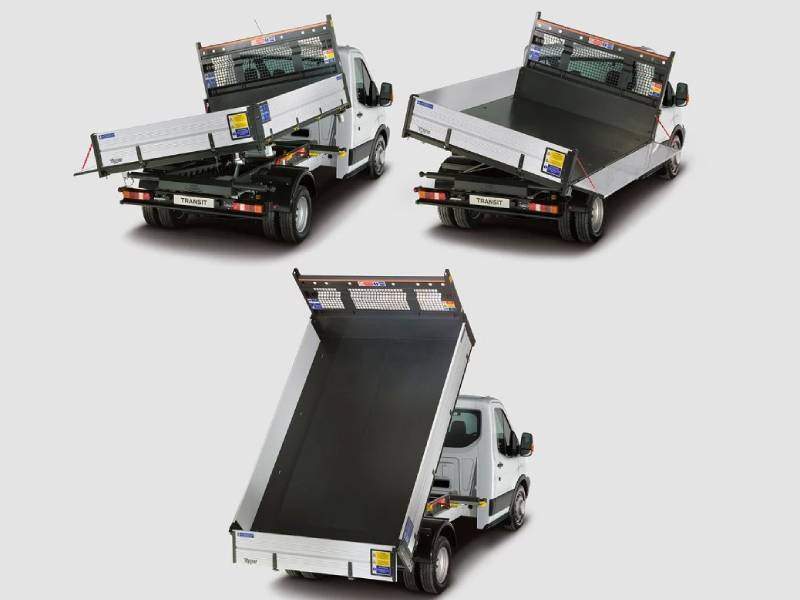 The 3-Way Tipper is designed to work in tight spaces. The load bed tips three ways (rear, or side-to-side left or right) so the load can safely be discarded in tight spaces. A remote wander lead gives you control from the cab while a side-mounted remote lever gives you manual control for top-hinged operation.